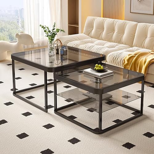Modern coffee tables for living room tables, Nesting Coffee Table Set of 2 for Living Room, Modern Side Tables with Sturdy Metal Frame and Tempered Glass.Minimalist End Table,Cocktail Table(Black Gray