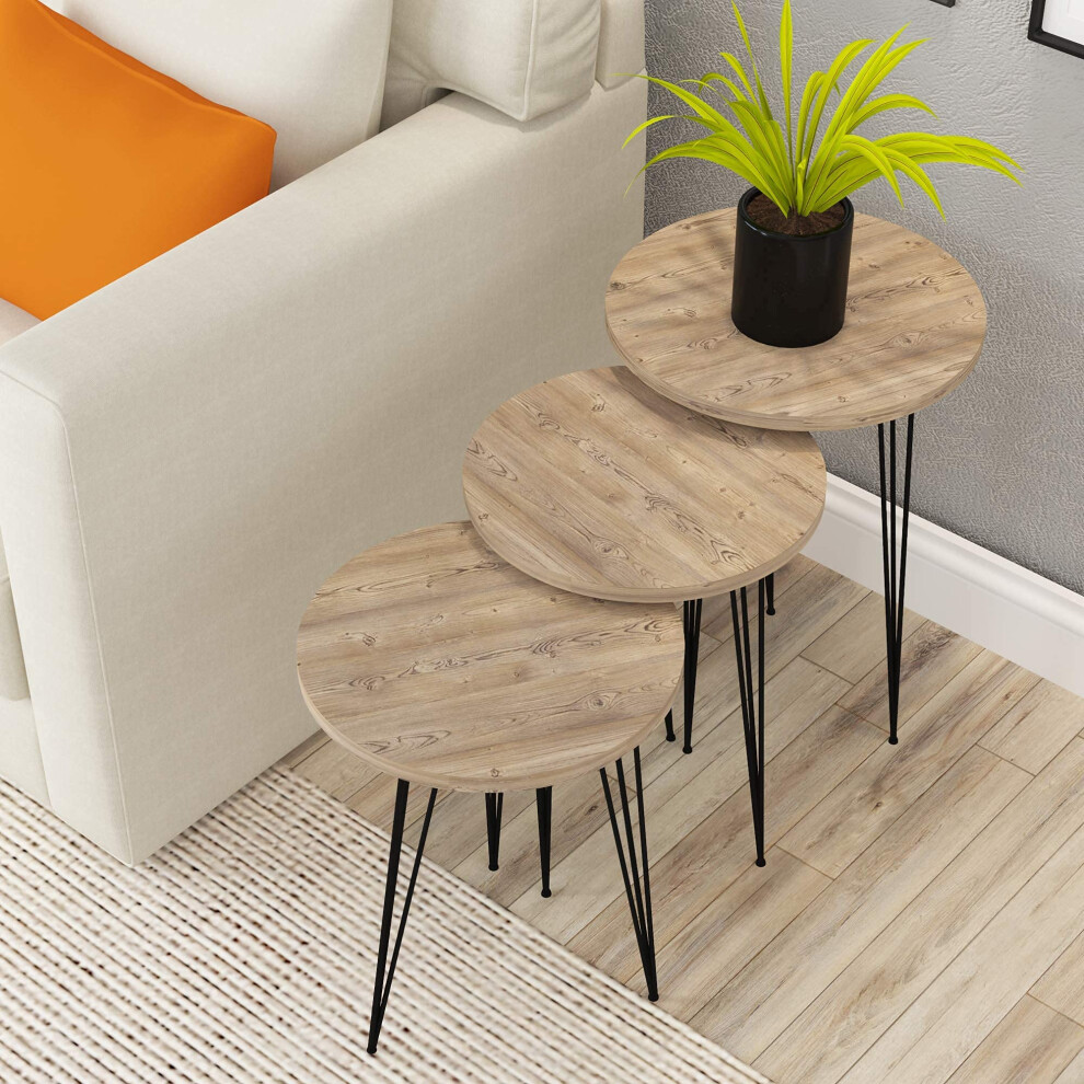 PAK HOME Set of 3 Pine Wood Grey Nesting End Tables Round Wood Stacking Coffee Side Accent Table with Metal Legs for Living Room, Home Office,