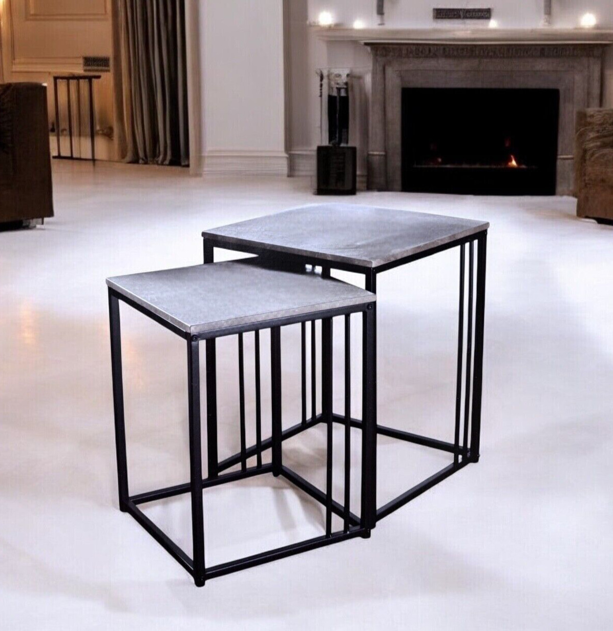 Set of 2 Grey Marble Effect Nesting Tables Metal Frame Coffee Side Tables Living