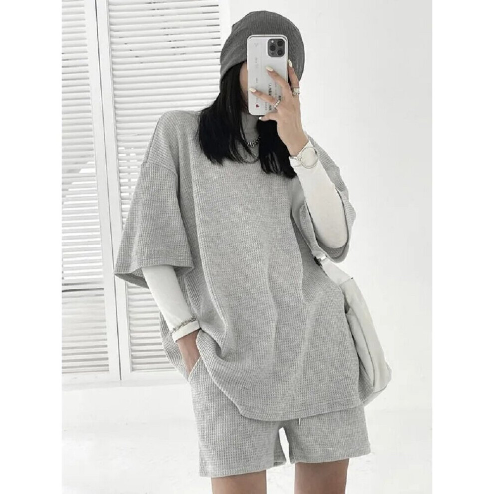 (Dark Gray XXL) Women Tracksuit Set V Neck Short Sleeve Loose Shorts Grey S