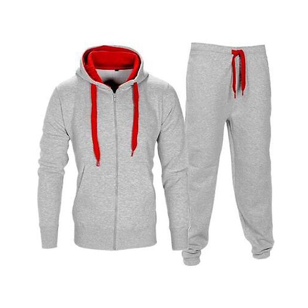 (Light Gray Red, M) Tracksuit Set Mens Fleece Zip Hoodie Topsbottoms Joggers Gym Jogging Contrast
