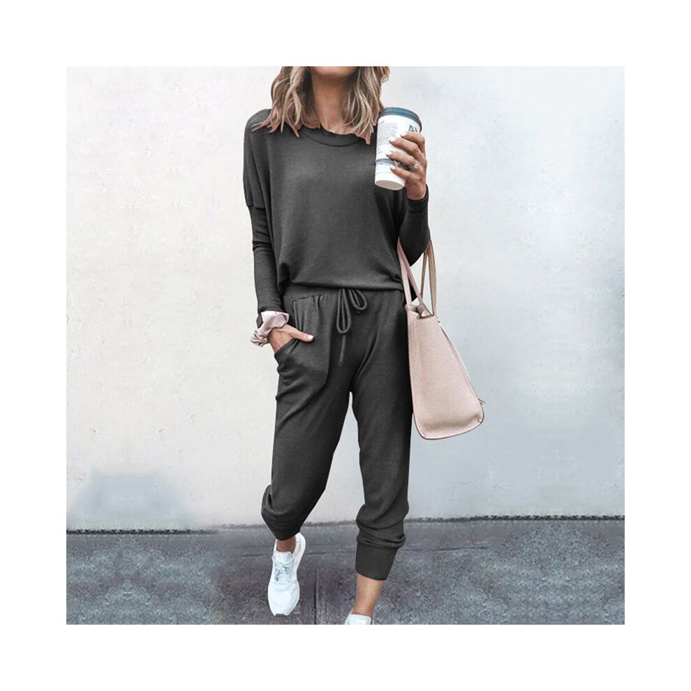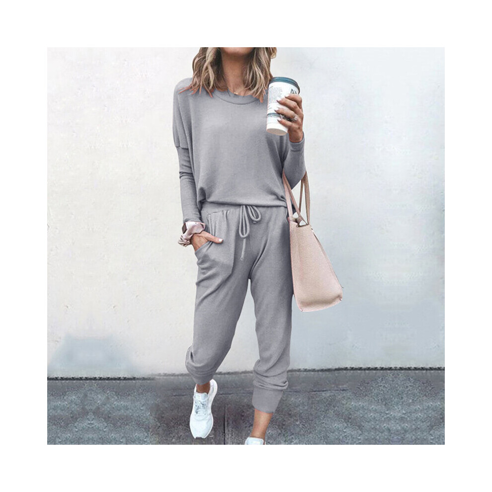 (Gray, L) 2pcs Tracksuit Women Set Ladies Solid Color Top Hoodies Pants Loungewear