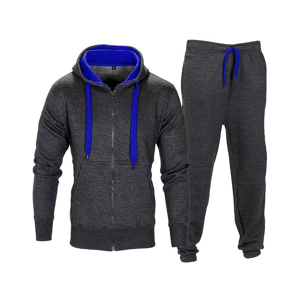 (Dark Gray Blue, M) Tracksuit Set Mens Fleece Zip Hoodie Topsbottoms Joggers Gym Jogging Contrast
