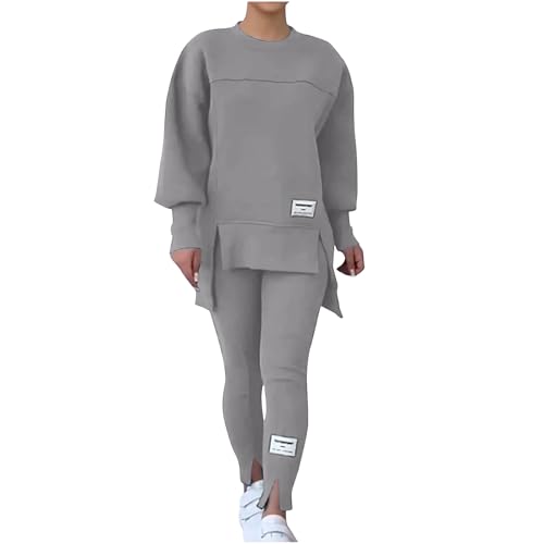NSICBMNO Gray Womens Tracksuit Set 2 Piece Outfits Oversized Sweatshirts Gym Leggings Airport Out Long Jumpers Split Hem Trousers Casual Co Ord Sets Winter Lounge Wear Sets For Gym Sports Travel