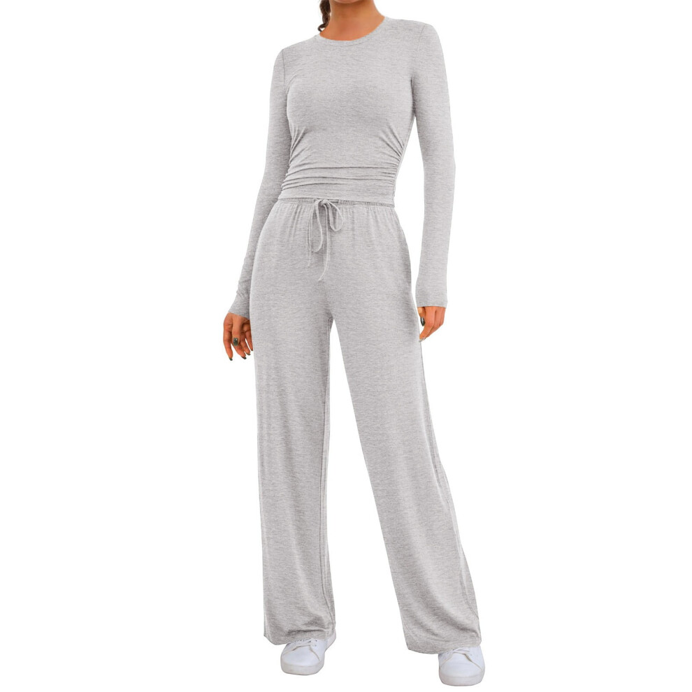 Women's Fall 2-Piece Outfits Long Sleeve Ruched Top & Wide Leg Pants Tracksuit Gray M
