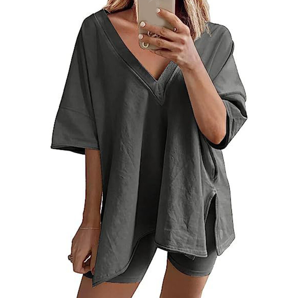(Dark Gray XL) Women Tracksuit Set V Neck Short Sleeve Loose Shorts Grey S
