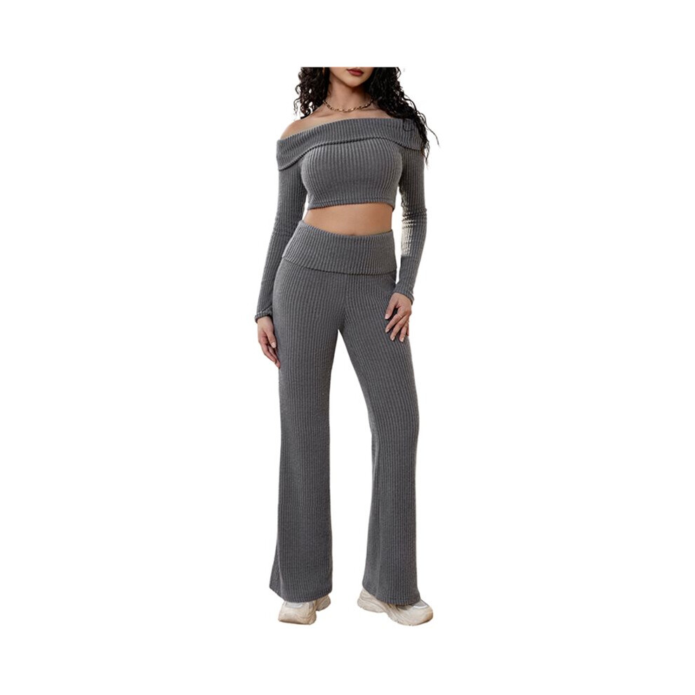 Womens 2 Piece Outfits Ribbed Knit Lounge Sets Off-Shoulder Sweatsuit Sets Flares Jogger Tracksuit Gray S