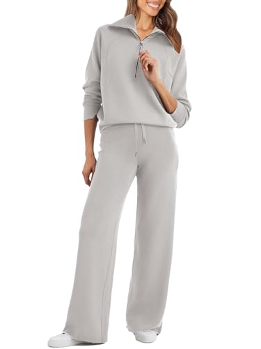 Glamaker Women 2 Piece Sweatshirt Set Oversized Half Zip Sweatshirt Wide Leg Lounge Set Tracksuit, gray, L