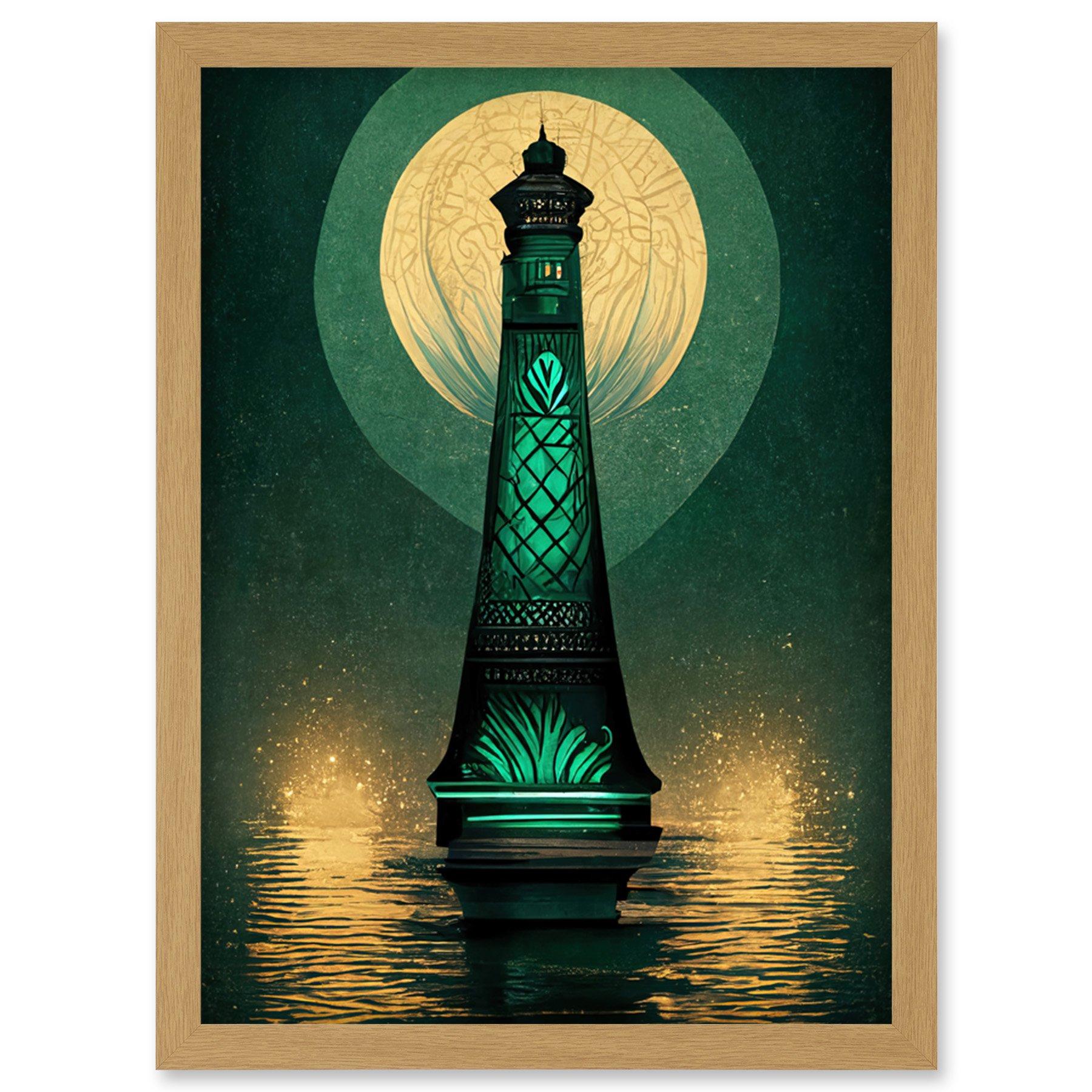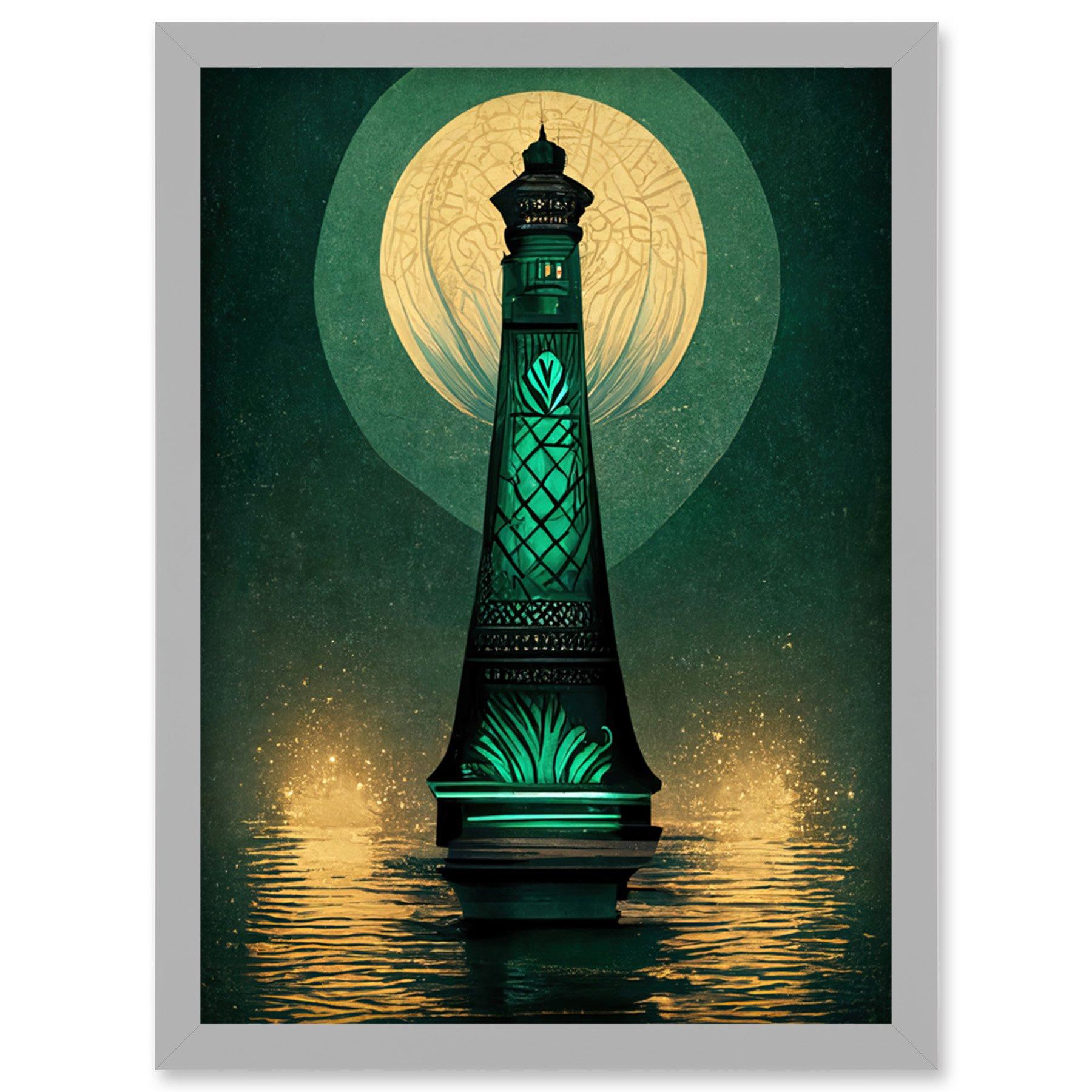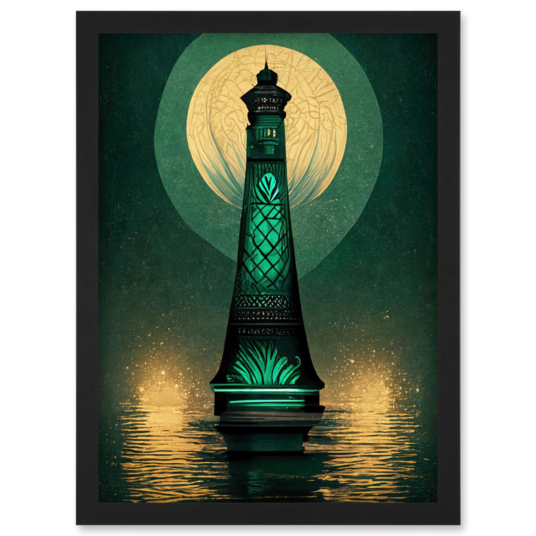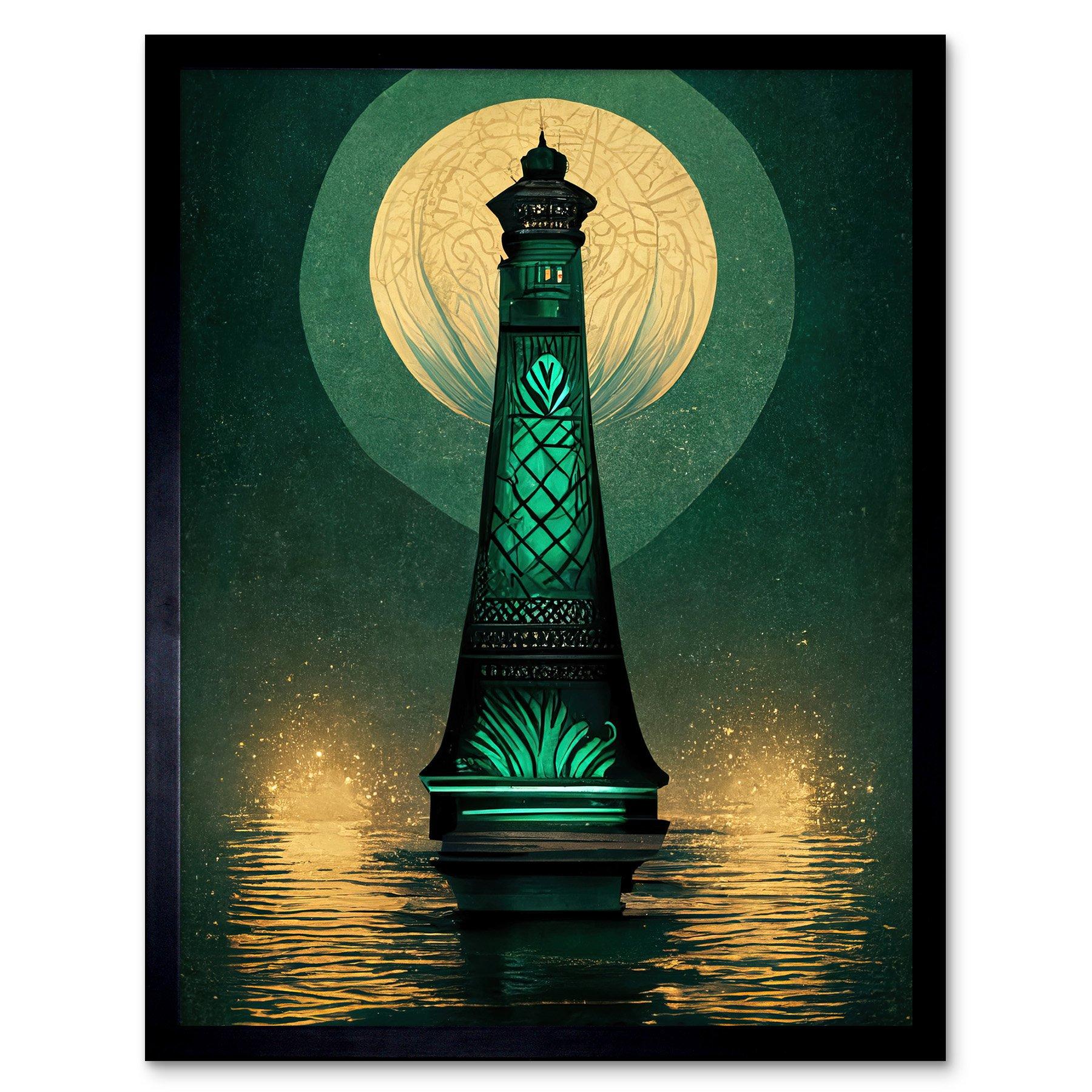 Art Deco Lighthouse Great Gatsby Moonlight Emerald Artwork Framed Wall Art Print A4