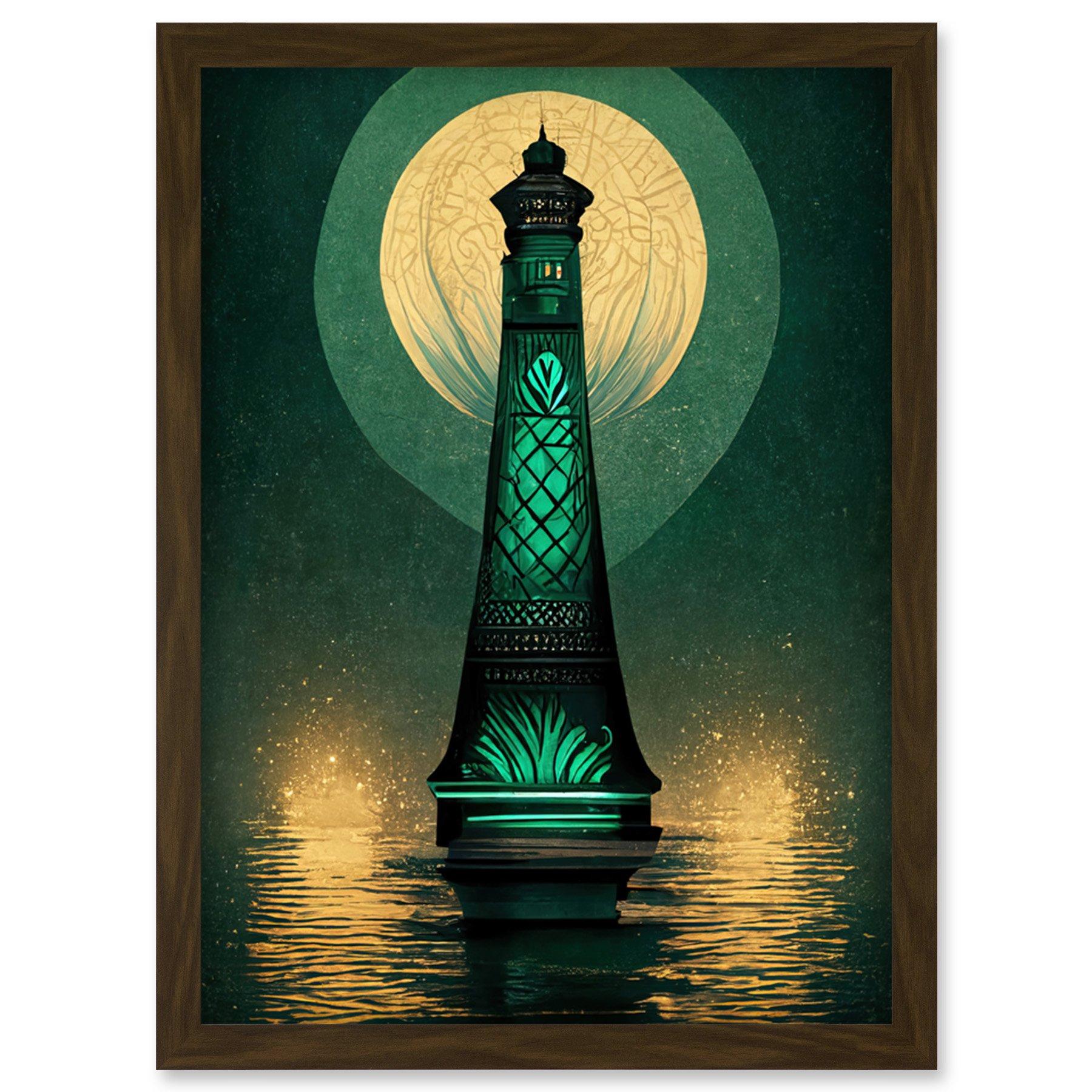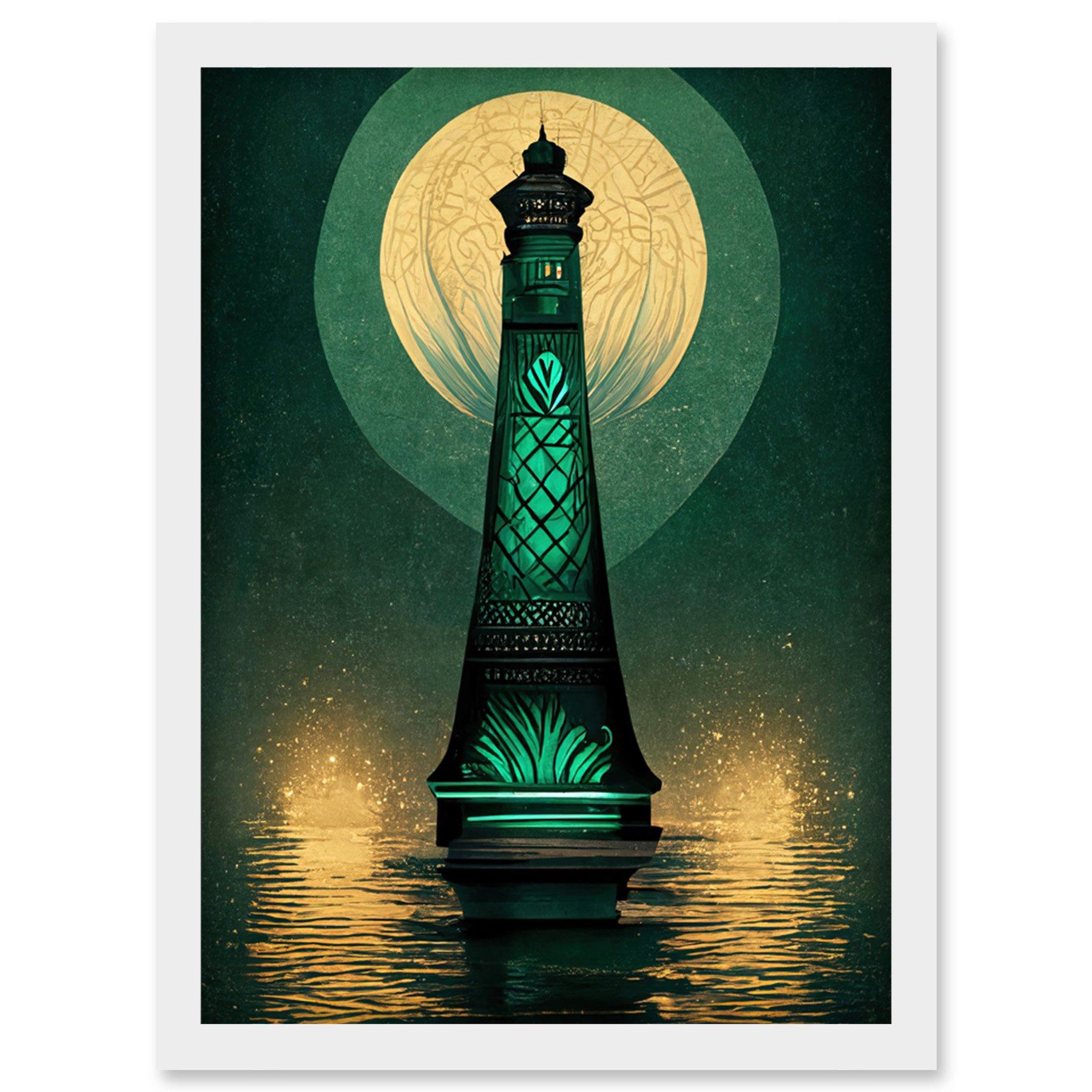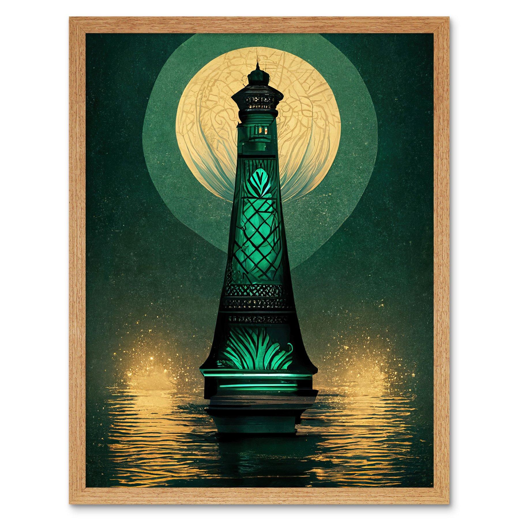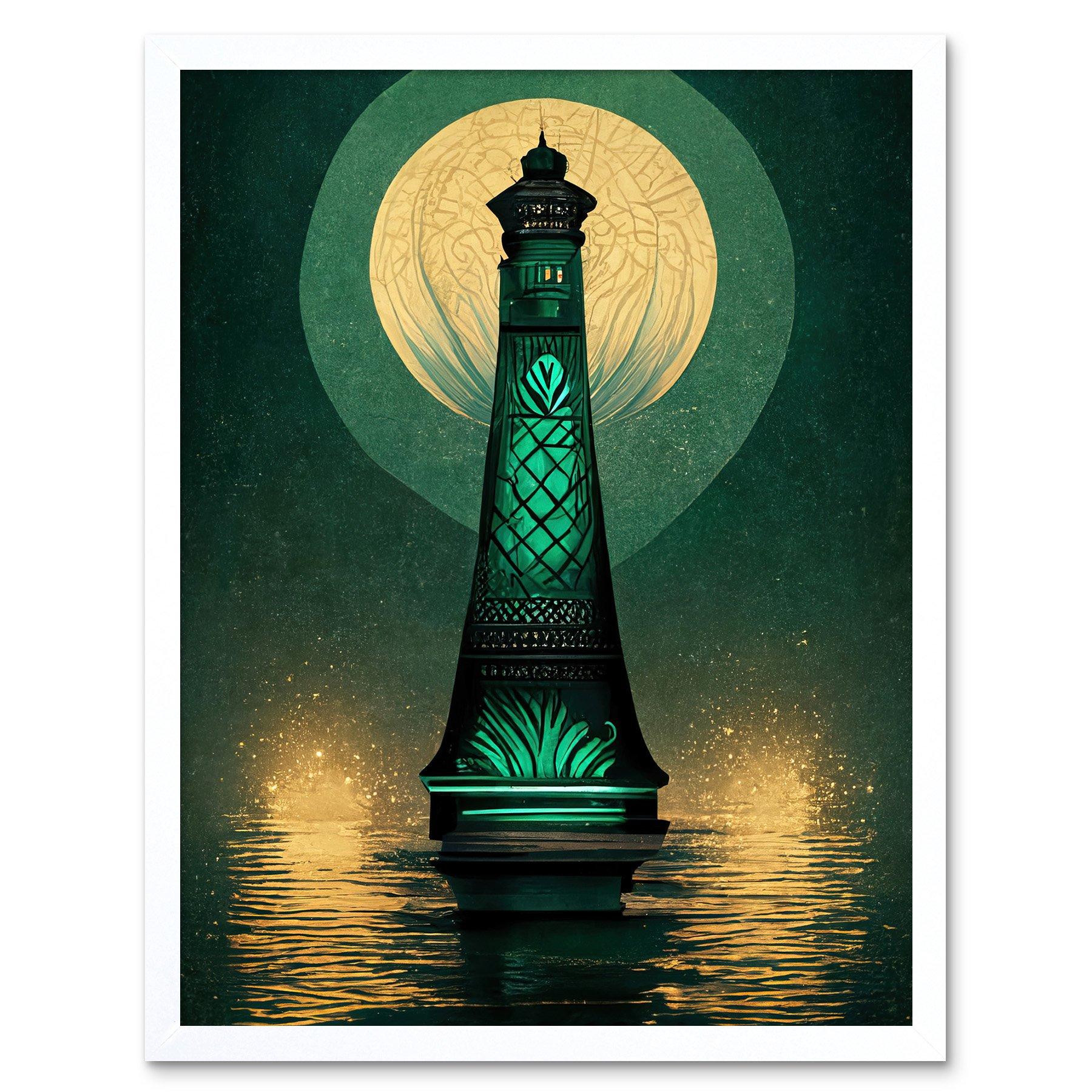 Art Deco Lighthouse Great Gatsby Moonlight Emerald Artwork Framed Wall Art Print A4