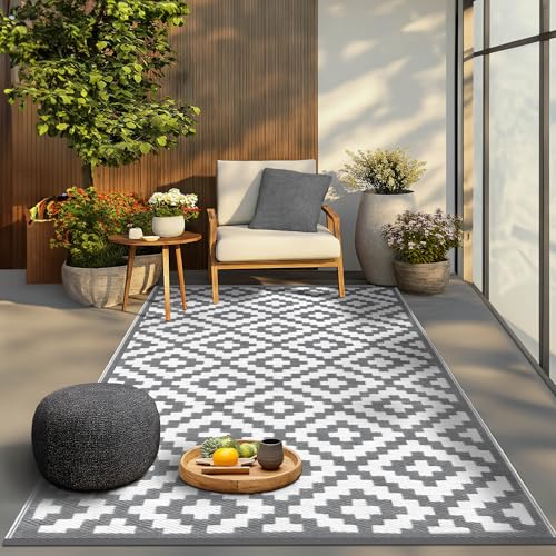 Green Decore Outdoor Rug Set of 4 Reversible Recycled Plastic Mat Perfect for Garden, Patio, Picnic, Patio, Stain and Water Resistant, Nirvana Grey, 120 x 180 cm