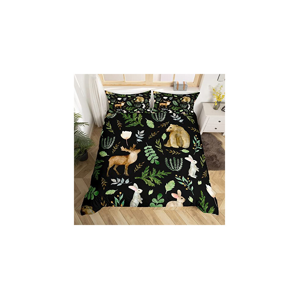 Watercolor Wild Animal Bedding Set Single Size,Deer Bear and Rabbit Print Duvet Cover for Kids Boys Bedroom Decor,White Flowers Green Leaves Plant