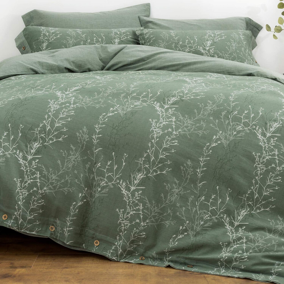 OREISE Duvet Cover Set Full/Queen Size Washed Cotton Yarn Jacquard Green and White Thin Branch Pattern Floral Style 3Piece Bedding Set