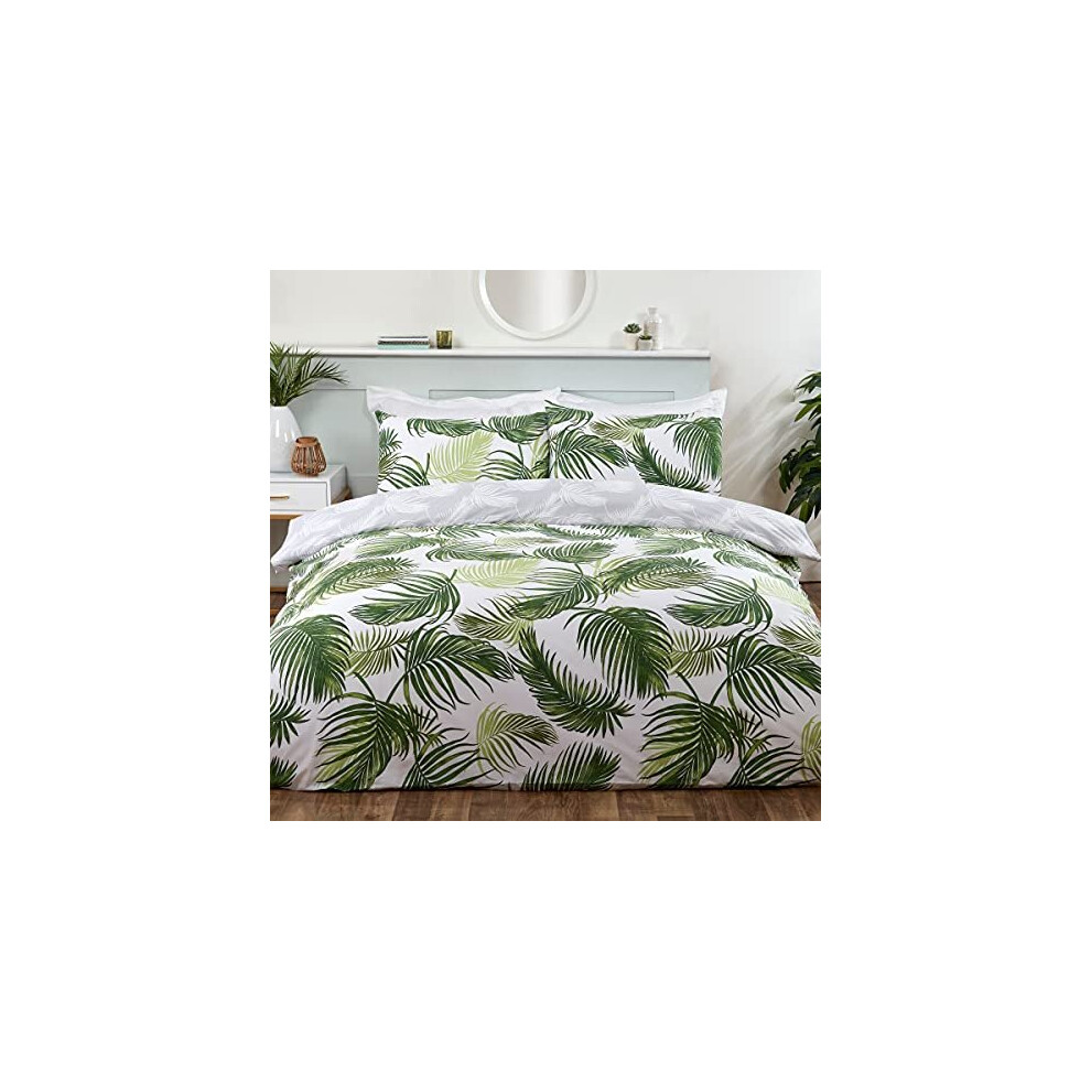Sleepdown Tropical Palm Leaves Floral Green White Grey Reversible Soft Easy Care Duvet Cover Quilt Bedding Set with Pillowcases - Double (200cm x