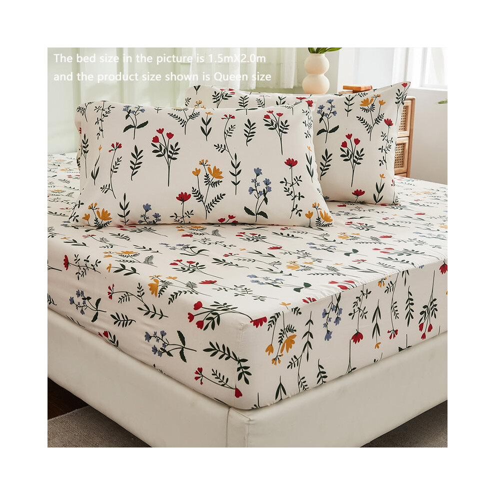 (White & Yellow & Red & Blue & Green, 198*203cm+30cm(50*75cm*2)) Floral Print Fitted Sheet & 2counts Pillowcase, 1 Set Boho Elastic Bedding Set, Cool