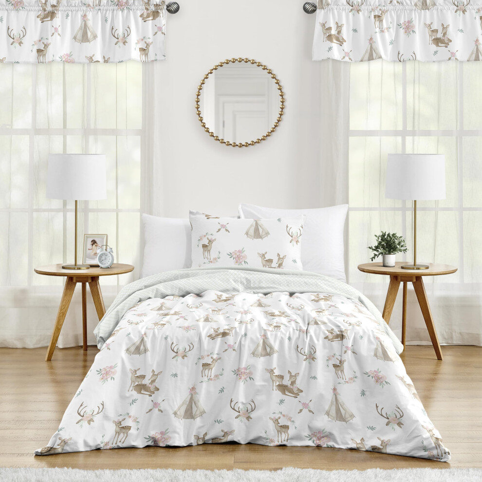 Sweet Jojo Designs Blush Pink Mint Green and White Boho Watercolor Woodland Deer Floral Girl Twin Kid Childrens Bedding Comforter Set - 4 Pieces
