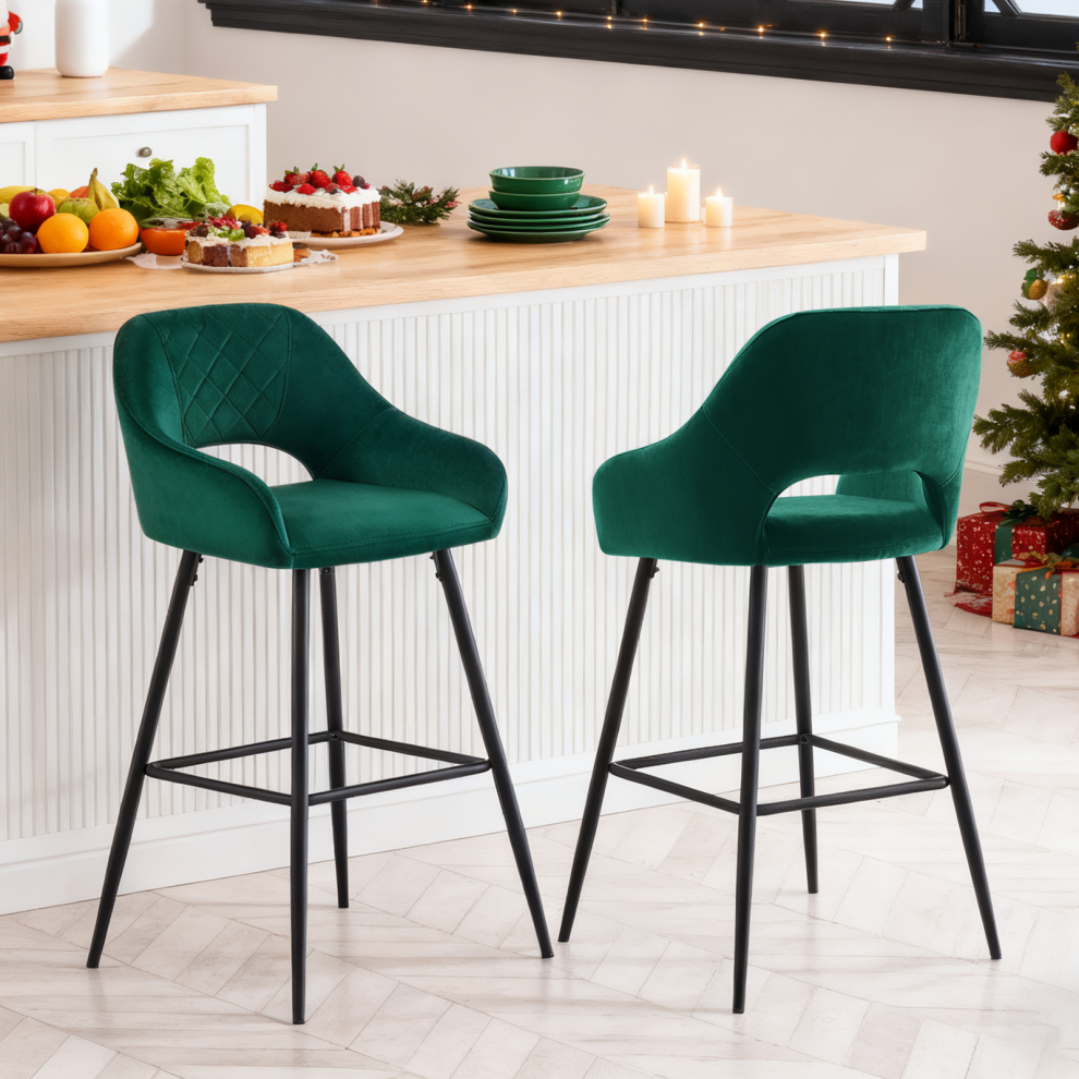 Haiko 2 x Velvet Green Bar Stools Kitchen Stool Upholstered Black Base Industrial
