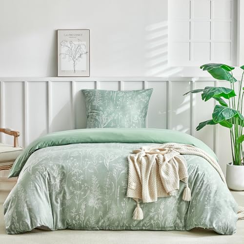 Tokokimo Sage Green Single Duvet Cover Set - Floral Bedding Set 2 Piece, Green Single Bedding Sets with Pillowcase, Soft Microfiber Duvet Cover 135x200 cm