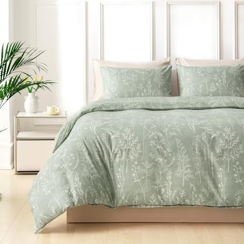 Aisbo Double Bedding Duvet Cover Sets - 3 Pieces Floral Bedding Set White and Sage Green, Soft Brushed Microfiber Double Bed Quilt Cover with 2 Pillowcase, 200x200 cm