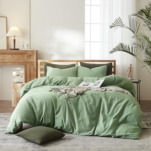 FOSSA Duvet Cover Set 100% Washed Cotton Linen Feel Super Soft Breathable Cozy 3 Pieces Bedding Sets Solid Sage Green Queen