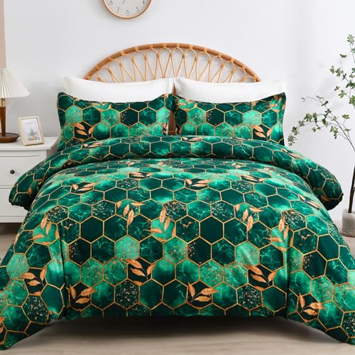 DJY Green Geometric Duvet Cover Golden Leaves Reversible Bedding Set, Soft and Breathable Lightweight Duvet Sets 3 Pieces With Zipper Closure (King, 220x230cm)