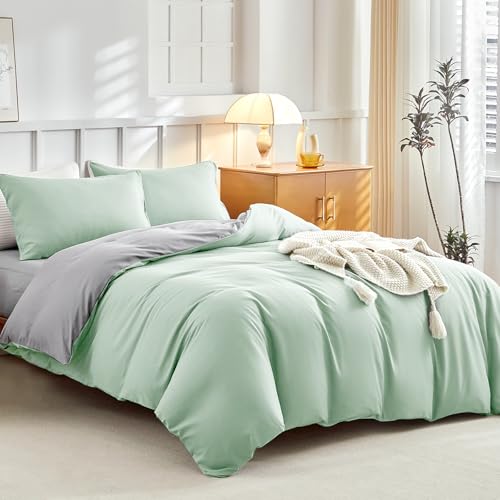 Soifox Double Duvet Set Sage Green and White, 3 Piece Microfiber Reversible Double Bedding Bed Sets, Soft and Non Iron Quilt Duvet Cover Set with 2 Pillowcases 50x75cm