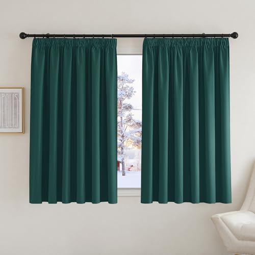 PONY DANCE Dark Green Thermal Blackout Curtains 54 Inch Drop for Bedroom, Living Room Blackout Pleat Curtains with Hooks for Track Short Curtains for Window Treatment, W46 X L54, Dark Green