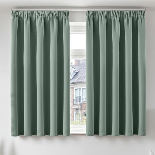 PONY DANCE Sage Green Blackout Thermal Curtains - Short Room Darkening Pencil Pleat Curtains for Bedroom, Living Room with Hooks, 1 Pair, W55 X L57
