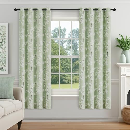 SUOUO Green Vintage Floral Blackout Curtains for Bedroom Print White Blossom Flower Room Darkening Thermal Insulated Window Drapes for Living Room 84 inches Long 2 Panels