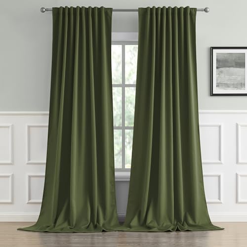 102 Inch Long Linen Blended Blackout Curtains 2 Panels, Back Tab Pleated Look Drapes for Track System with Hooks, Noise Reducing Country Blackout Winodw Curtains 50x102-Loden/Olive Green