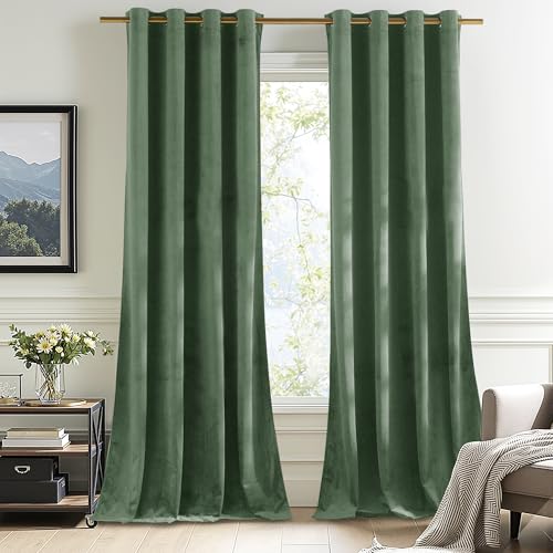 Lazzzy Green Velvet Blackout Curtain Thermal Insulated Curtain for Bedroom Living Room Darkening Privacy Drapes Noise Reducing Velvet Curtain Rod Pocket 90 Inch Long Curtain 1 Panel Sage Green