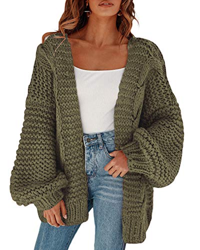 Cicy Bell Women's Open Front Chunky Knit Cardigan Loose Lantern Sleeve Oversized Sweater Coats - Green - Small