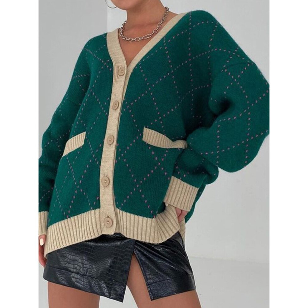 Loose Y2K Green Cardigan Women Sweater V-Neck Knitted Plaid Long Sleeve Sweaters Female Winter Patchwork Vintage Tops