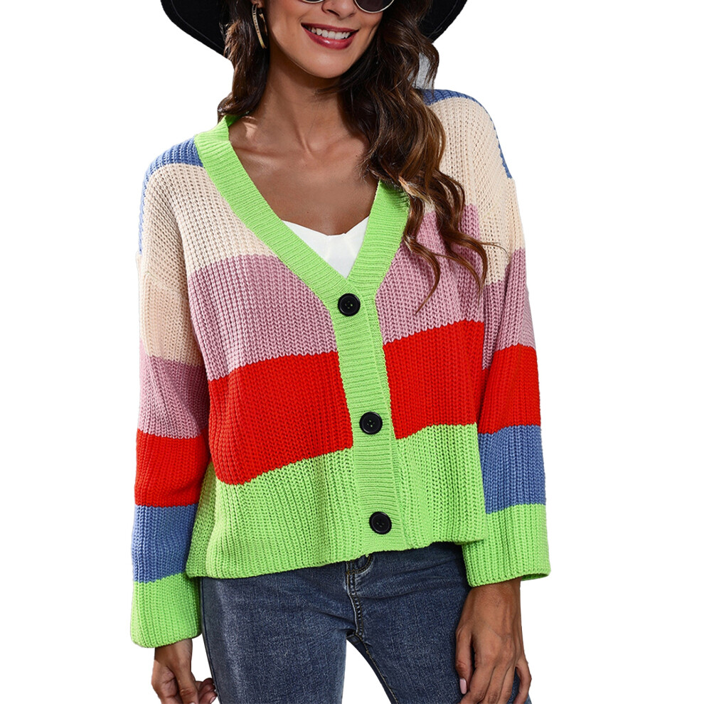 (Green S) Women Cardigan Sweater V Neck Crochet Striped Yellow L