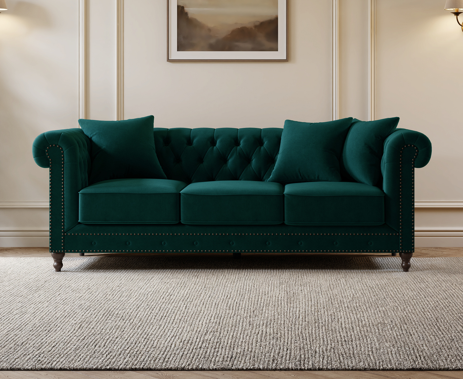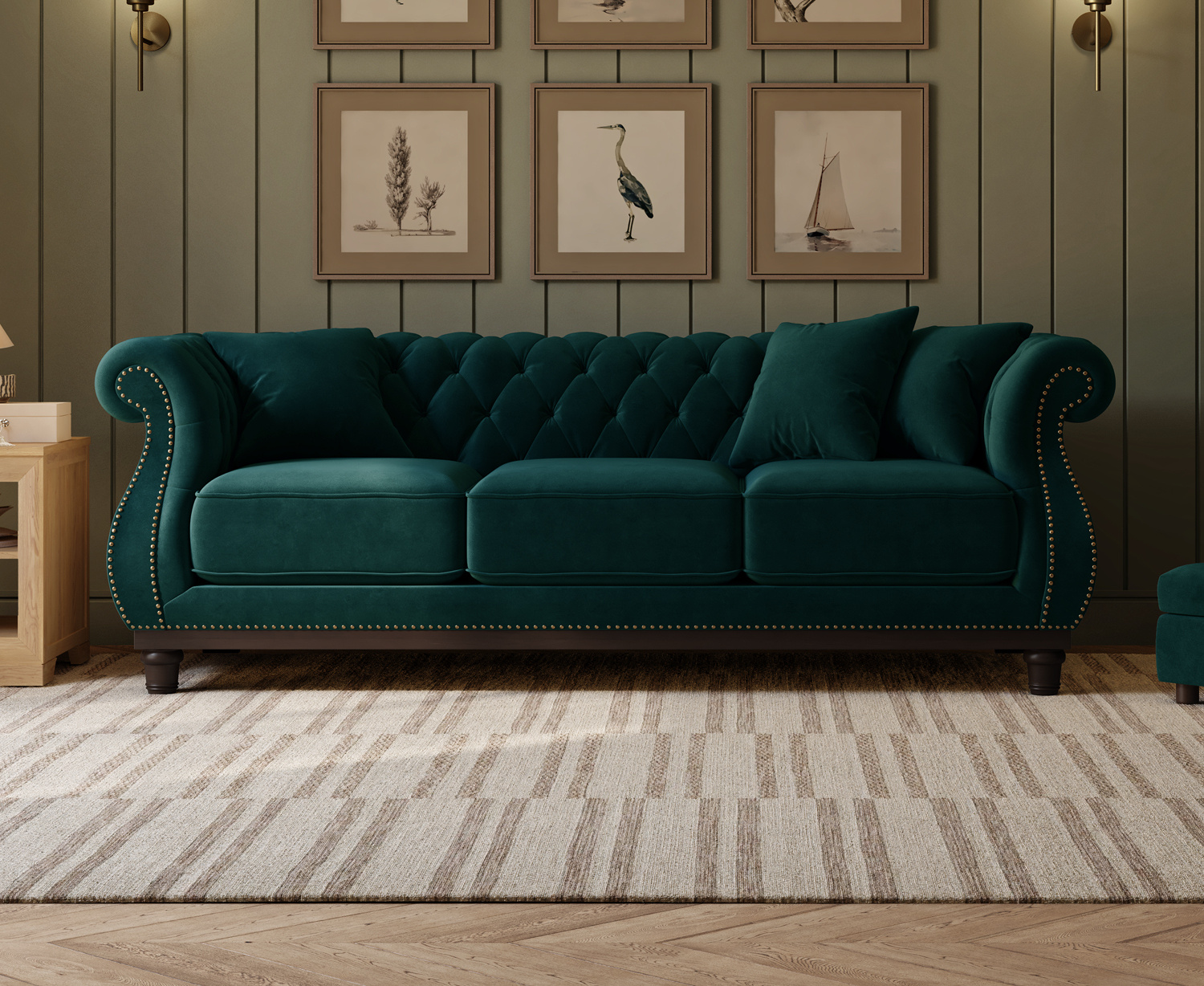 Eva Chesterfield Green Velvet Three-Seater Sofa