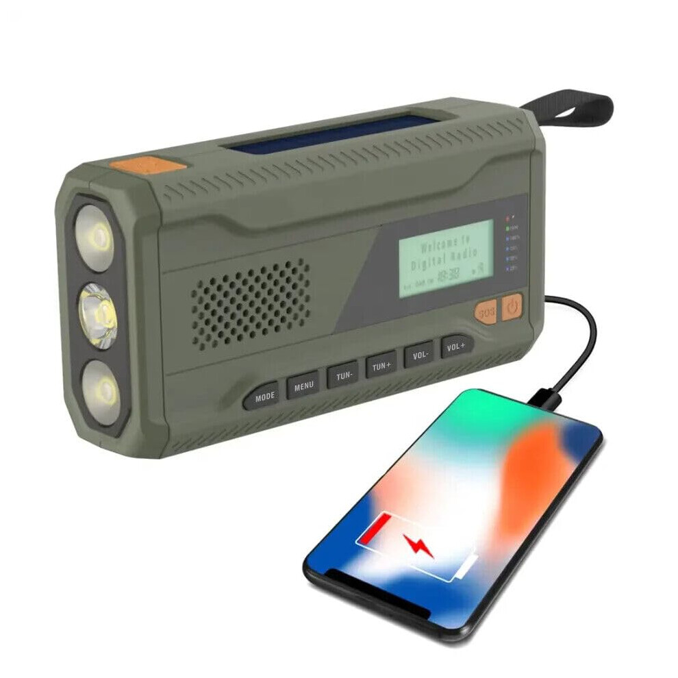 Portable Solar Powered Flashlight With Bluetooth DAB FM Radio, SOS Alarm, Crank, 2000mAh Battery, Camping Green WR6