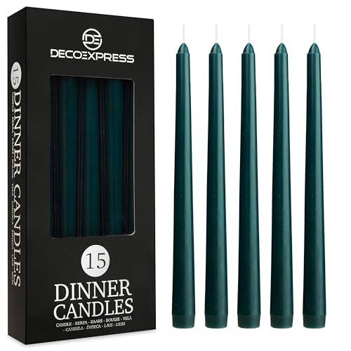 DECO EXPRESS Candles Set Classic Dripless Tapered Metallic Unscented 8H Burning Time, Decorative Dinner Candles for Restaurant Home Christmas (Green, 15 Pack)