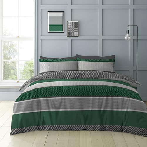 GC GAVENO CAVAILIA Geometrical Bedding Sets King Size Green Duvet Cover | 3Piece Reversible Geometric Stripe Kingsize Duvet Cover Sets (220x230 Cm) | Hypoallergenic Quilt Covers Set With Pillow Cases