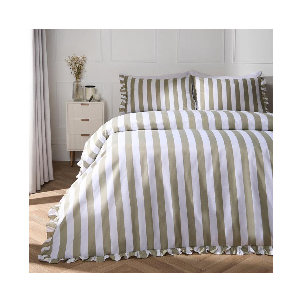 (Sage/White, King) OHS Frill Edge Duvet Set Stripe Gingham Print Soft Cosy Warm Plump Plush Duvet Cover and Pillowcase Bedding Set Single Double King