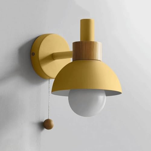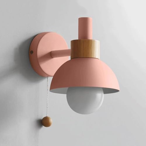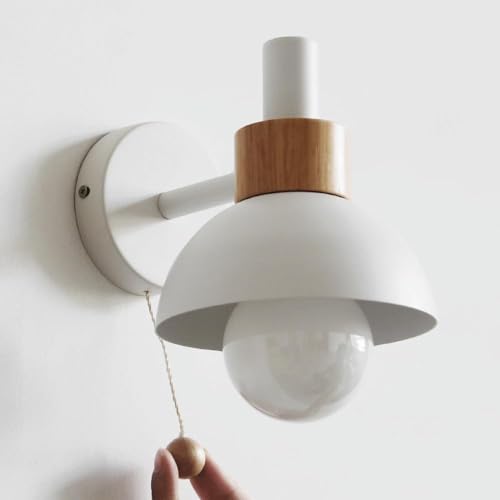 LNNSNE Kids Room Nordic Wall Lamp with Pull Chain Switch, Solid Wood Finish, Green/White/Pink/Yellow Shades, (White)