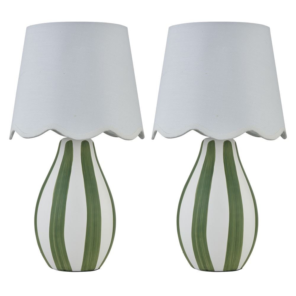 Set of 2 Green & White Stripe Ceramic Table Lamp Bedside Lights Scalloped Shades