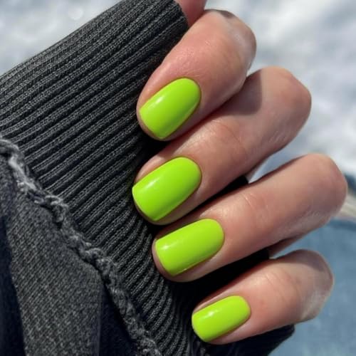SXVME 48 Pcs Neon Green Press on Nails Short Square Acrylic False Nails Short Coffin Natural Fake Nail Set Elegant Solid Color Full Cover Glossy Gel Stick on Nails for Women Daily Wear