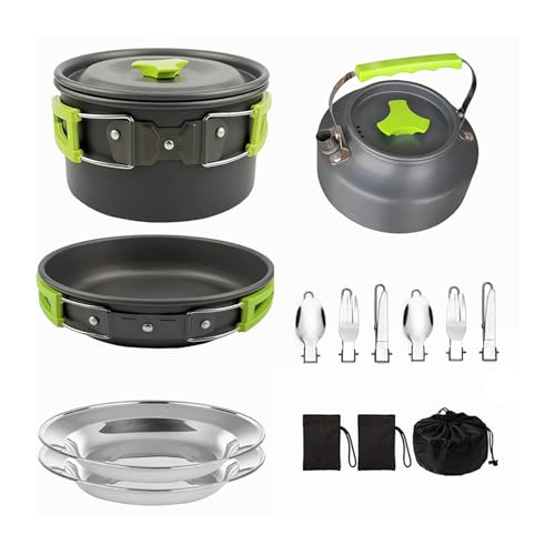 Camping Cookware Mess Kit, Portable Outdoor Cooking Set for Backpacking, Hard Oxidized Aluminum Pot Pan Teapot with Folding Fork Knife Spoon Kit, Lightweight Compact for Camping Hi (Green)