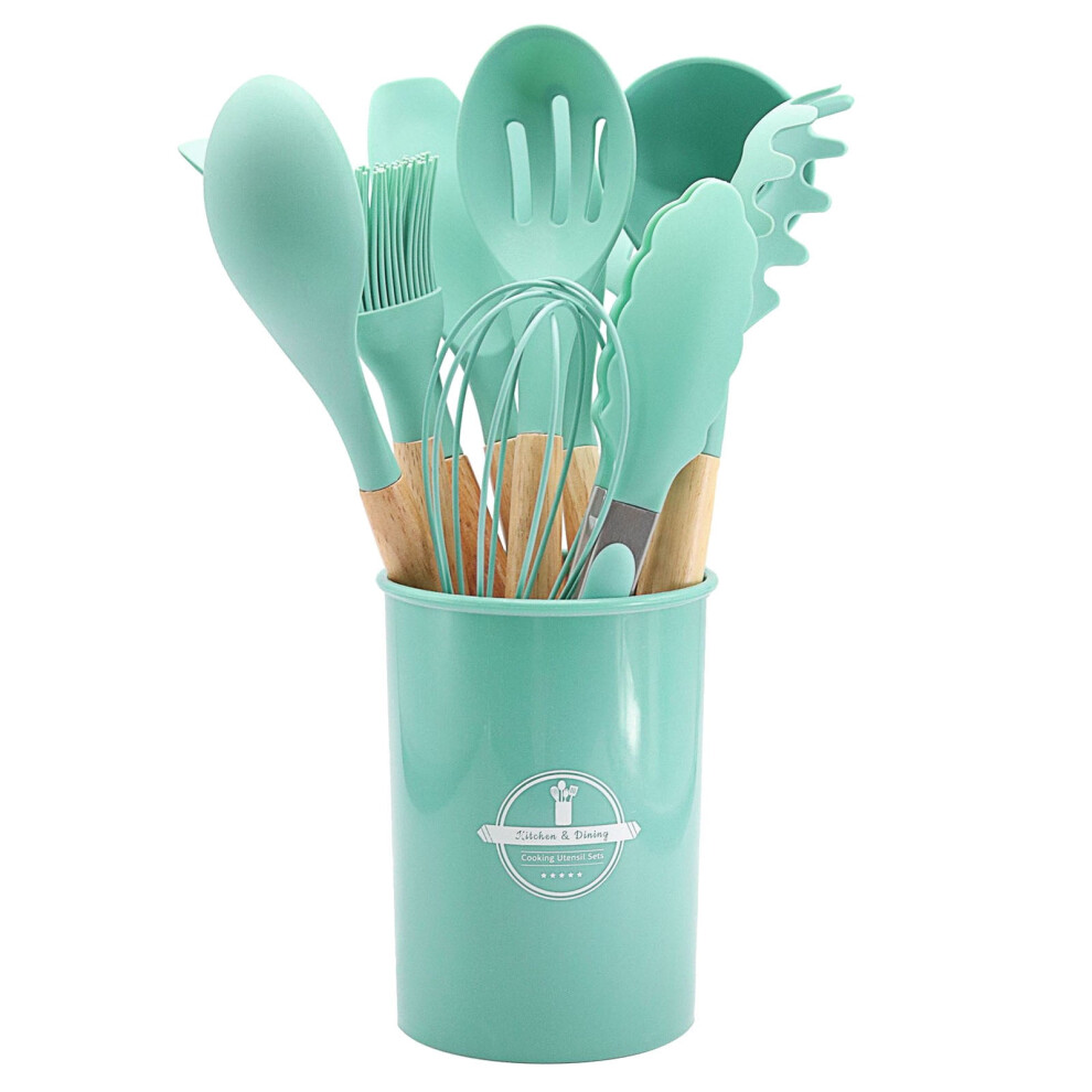 Home Decoration,Cooking Non-stick Pan Storage Bucket Wooden Handle Silicone Kitchenware 12-piece Silicone Kitchenware Set,Mint Green,