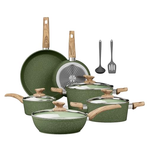 Kitchen Academy Induction Cookware Sets - 12 Piece Cooking Pan Nonstick Set, Granite Green Pots and Pans Set