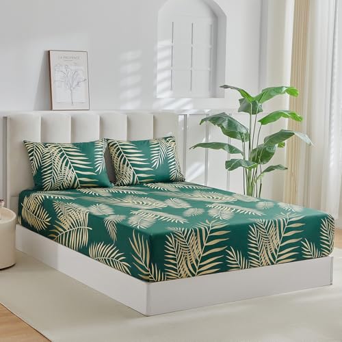 Tokokimo Double Fitted Sheet with 2 Envelope Pillowcases - Soft Microfibre Leaves Print Emerald Green Fitted Bed Sheets Double 35cm Deep Fit, 135x190 cm (Fits Mattress Up to 35cm Deep)