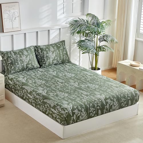 Tokokimo Double Fitted Sheet with 2 Envelope Pillowcases - Soft Microfibre Little Floral Flowers Print Sage Green Fitted Bed Sheets Double 35cm Deep Fit, 135x190 cm (Fits Mattress Up to 35cm Deep)