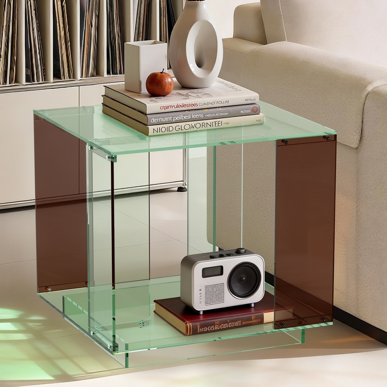 Modern Green Acrylic Side Table Square Cube Coffee Table with Open Storage Shelf