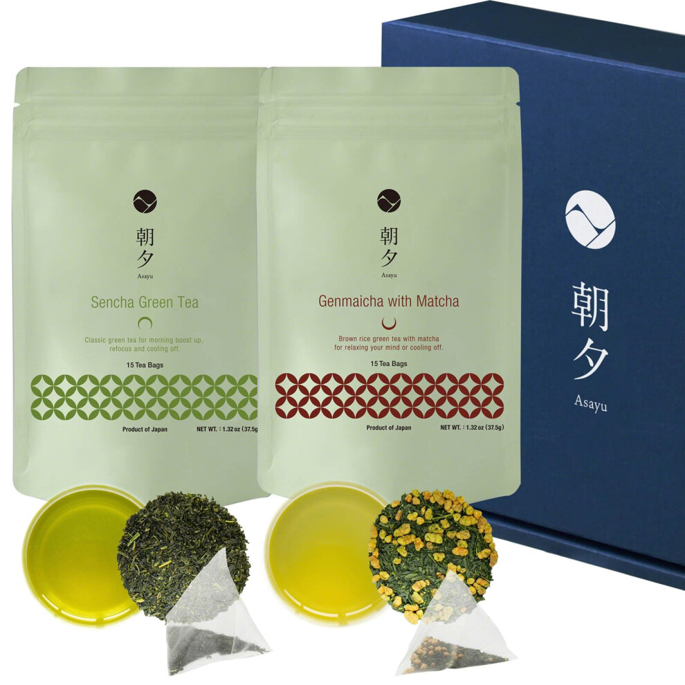 Asayu Japan Green Tea Gift Set, Sencha & Genmaicha with Matcha, 30 Tea Bags, Roasted Rice & Premium Japanese Green Tea, 100% Made in Japan (Sencha &