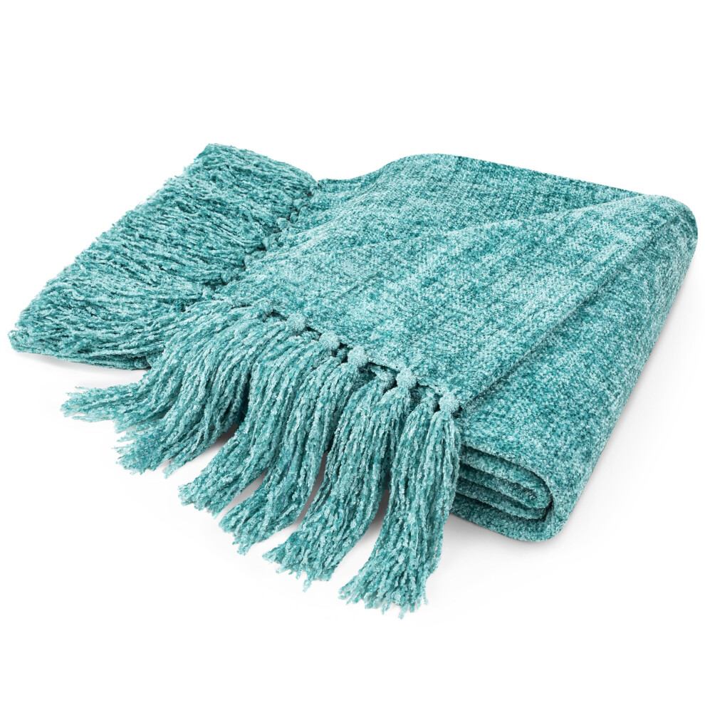 PAVILIA Teal Green Throw Blanket for Couch, Chenille Blanket for Sofa Bed, Soft Knit Woven Turquoise Blanket with Tassel, Decorative Blanket for Chair